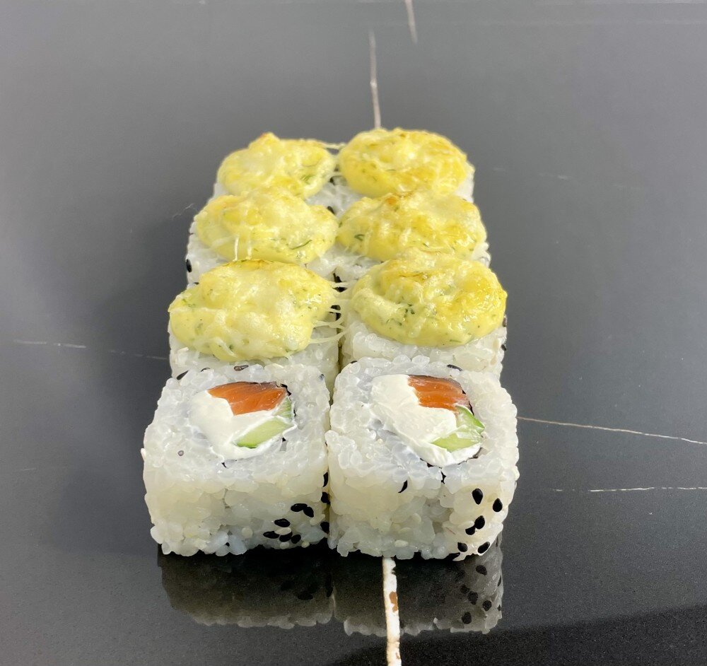 Рис, сыр, лосось, огурец, кунжут, белый соус, нори, пармезан.