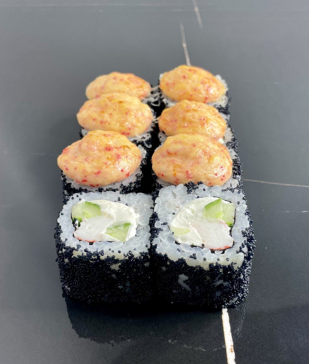 Рис, сыр, снежный краб, огурец, масаго, соус хот, нори, пармезан.