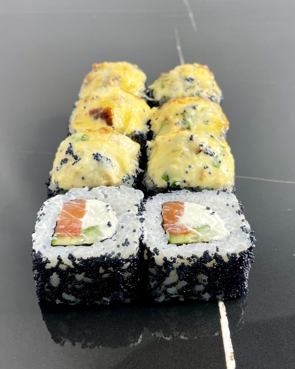 Рис, сыр, лосось, огурец, масаго, угорь, лук зеленый, майонез, нори, пармезан.