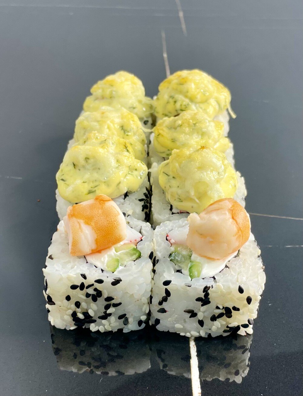 Рис, сыр, огурец, креветка, снежный краб, кунжут, белый соус, нори, пармезан.