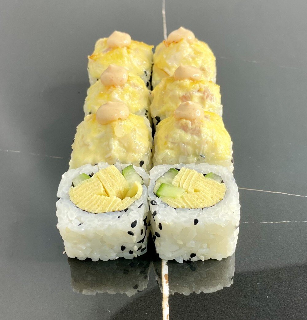 Рис, омлет, огурец, майонез, курица, бекон, спайси, кунжут, нори.