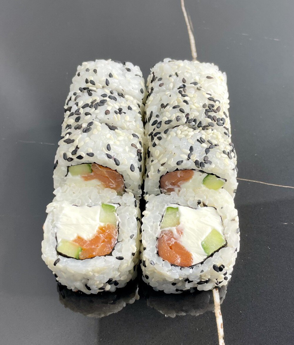 Рис, сыр, огурец, лосось, нори, кунжут.