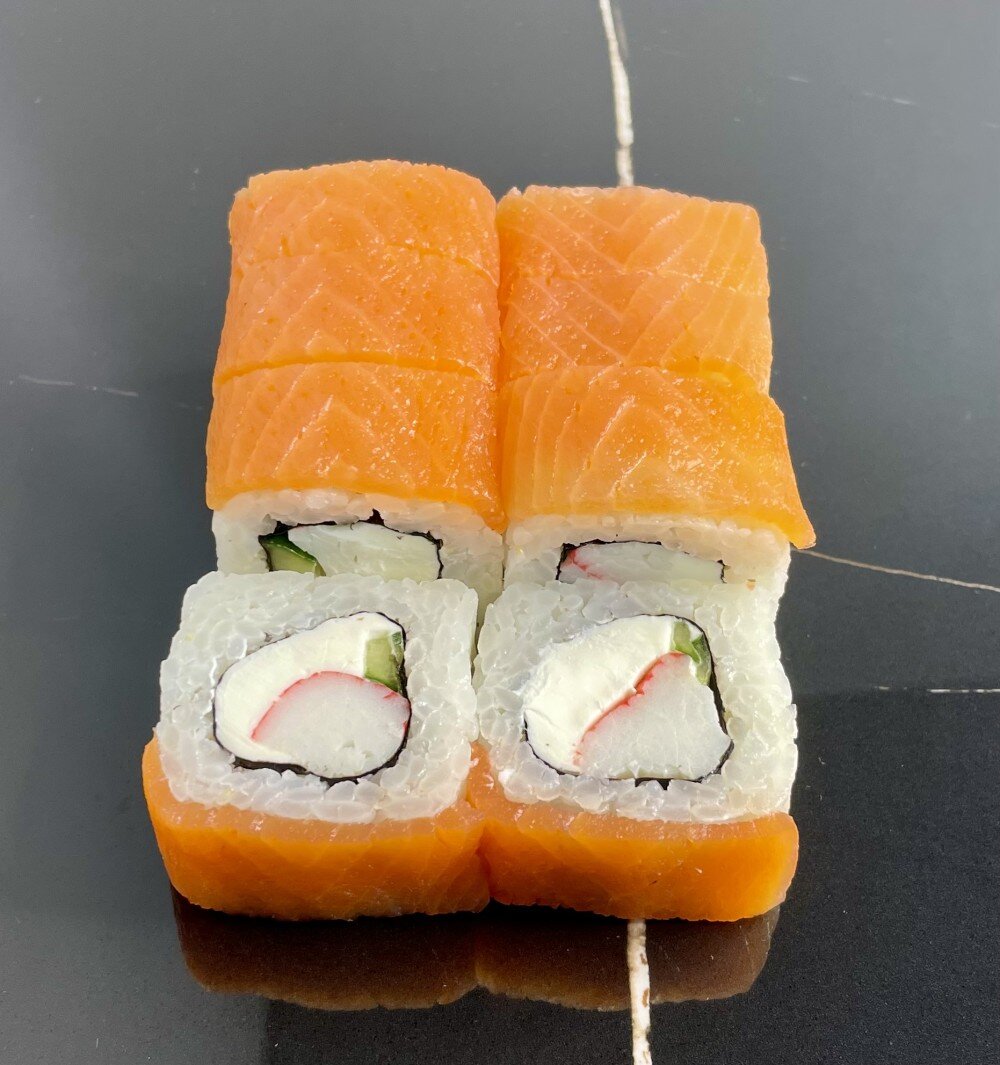 Рис, сыр, огурец, снежный краб, лосось, нори.