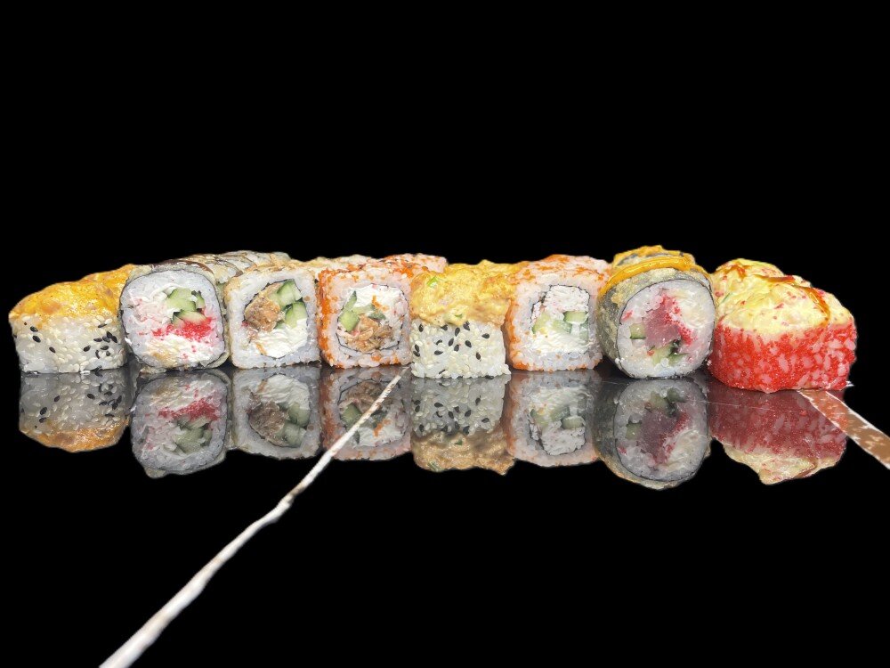 Лосось-краб терияки,Спайси тунец, Калифорния темпура,Темпура тунец,Запеченная креветка терияки, Запеченный спайси лосось,Калифорния снежный краб,Лосось терияки