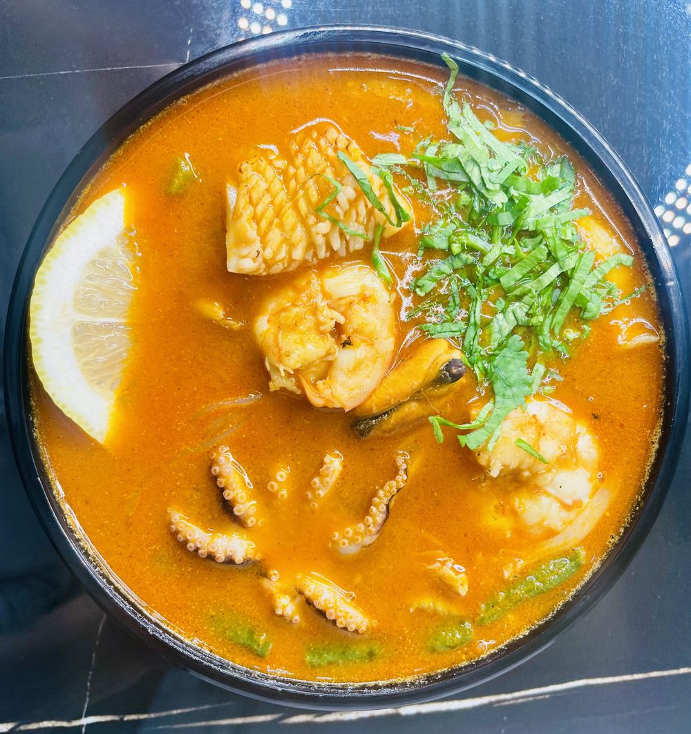 Бульон, креветки , осьминог , кальмар , мидии, фасоль стручковая , грибы вешенки , кинза , лимон